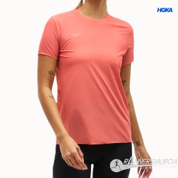Camiseta Hoka para running de mujer. Su tejido es de una malla ligera, perforada para una máxima transpirabilidad y secado rápido, con tratamiento antimicrobiano que evita los malos olores. Corte ajustado. Detalle del logotipo de la marca reflectante.
