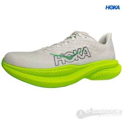 Zapatilla  Hoka de running con placa de Pebax, zapatillas muy dinámicas y ligeras para entrenamientos rápidos o competiciones de distancia, tanto corta como maratón, ideales para los corredores más exigentes. Su media suela está construida con dos espumas de densidades diferentes. Bajo la plantilla incorpora una espuma PEBA, muy ligera, muy reactiva y altamente resistente. La parte inferior de la media suela está formada por la famosa espuma de Hoka,su ProFlyX™, de mayor densidad que la anterior, para dar más soporte a la zapatilla. Entre ambas espumas Hoka introduce una placa de PEBAX, que en esta nueva versión, la extiende, en forma de ala, en la zona de los metatarsos para ayudar a sentar mejor el pie y aportar una estabilidad extra en la fase de despegue. Upper de nueva malla jacquard, que ofrece un buen ajuste, y un talón y una lengüeta más acorchada que su versión anterior. Drop 5 mm.