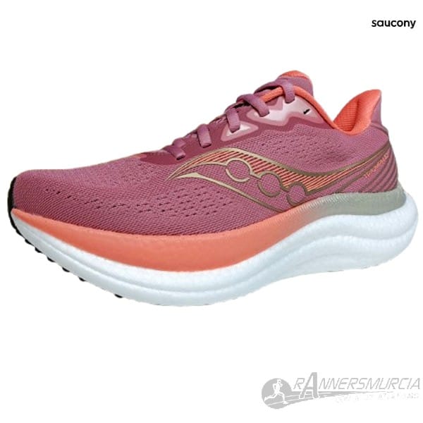 Zapatillas Saucony tope gama de amortiguación para corredoras de pisada neutra. Su media suela está íntegramente formada por la espuma PWRUN PB pero, en esta vigésimo tercera versión, han reformulado la espuma PB consiguiendo el mismo retorno de energía pero con un peso más ligero y un tacto más suave. Plantilla SRS premium para mayor confort. La suela está fabricada con el ya conocido XT-900 Carbon Rubber, un material bastante resistente al desgaste, que viene, en esta ocasión, en 3 piezas, la del antepie, la de la zona de aterrizaje en el talón y la zona de apoyo del talón, dejando libre la zona media para una transición más dinámica y flexible. Upper más suave y ligero. Otra novedad es el aumento de la base de la zapatilla, 1 mm más ancho en el medio pie y 7 mm más ancho en la zona delantera, lo que mejora el confort en el medio pie. Drop 10 mm.