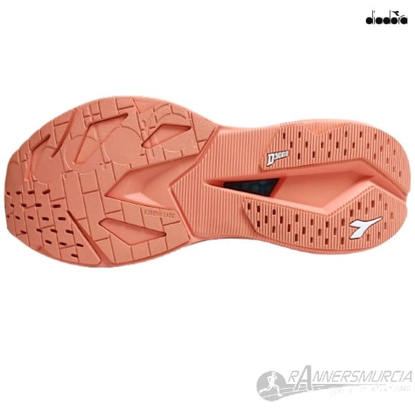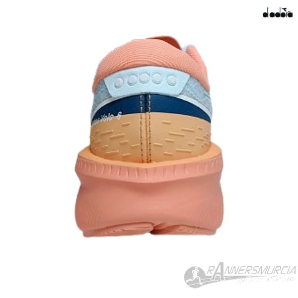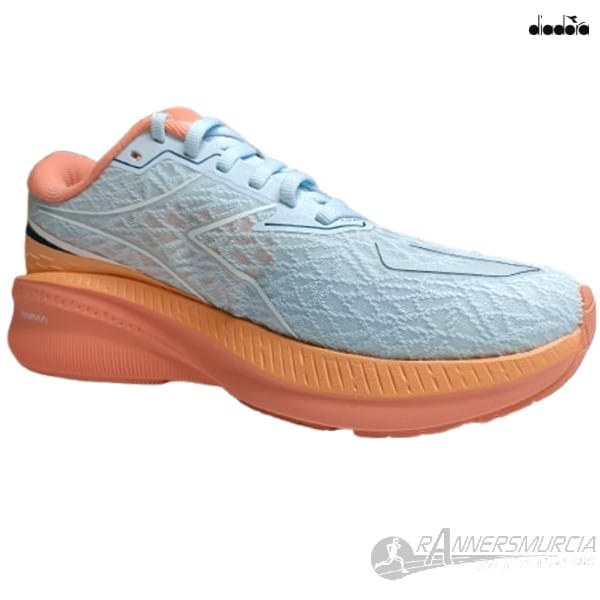 Zapatilla de running para corredoras de peso medio y pisada neutra o ligeramente pronadora. Su media suela está formada por las tecnología de Diadora, BluShiel, una EVA ligera y amortiguada que mantiene la anatomía natural del pie, compensando el comportamiento asimétrico de los pies, y la tecnología Anima, una combinación de amortiguación, reactividad (un 30 % más reactiva) y ligereza (reduce su peso un 20 %). La tecnología CCB controla la torsión del calzado en la zona plantar aportando estabilidad en la pisada. La zapatilla incorpora una plantilla extraíble DDATTIVO, fabricada con una espuma de alta densidad para aportar una gran capacidad de absorción de los impactos. Además, esta plantilla es altamente transpirable y contiene componentes antibacterianos que evitan los malos olores. Suela de gran durabilidad diseñada en dos partes. La parte delantera utiliza el compuesto Soplar Flexoft, un compuesto más reactivo y flexible. La parte del talón utiliza el compuesto Duratech 5000 que aporta una gran resistencia a la abrasión y ofrece una gran durabilidad. . Upper de Nailon Air Mesh que ofrece un buen ajuste y transpirabilidad. Drop 10 mm.