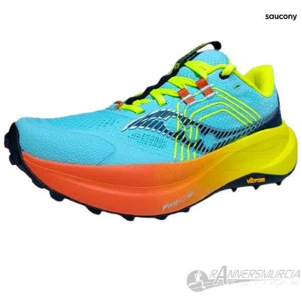 Zapatillas de trail-running que ofrecen máxima amortiguación bajo los pies, lo que las hacen que sean ideales para ultras o largas distancias. Su media suela está formada por la combinación de la tecnología PWRRUN y la tecnología PWRRUN PB de Saucony. Su goma EVA, PWRRUN aporta confort y una excelente amortiguación, su PWRRUN PB, situado bajo el pie, aporta, además de amortiguación, ligereza y reactividad. Esta nueva versión incorpora un 8 % más de PB bajo los pies que en su versión anterior. La suela está compuesta por el ya conocido caucho Vibram Megagrip, y lo extiende por toda la suela para una mayor protección y durabilidad. Su upper viene reforzado, con una malla fuerte y resistente al desgaste, con lengüeta integrada tipo calcetín, que aporta un ajuste extra, cubierta por una fina malla, para evitar que entre polvo o piedrecitas dentro del pie. Su drop se mantiene en los 6 mm, al igual que su versión anterior.